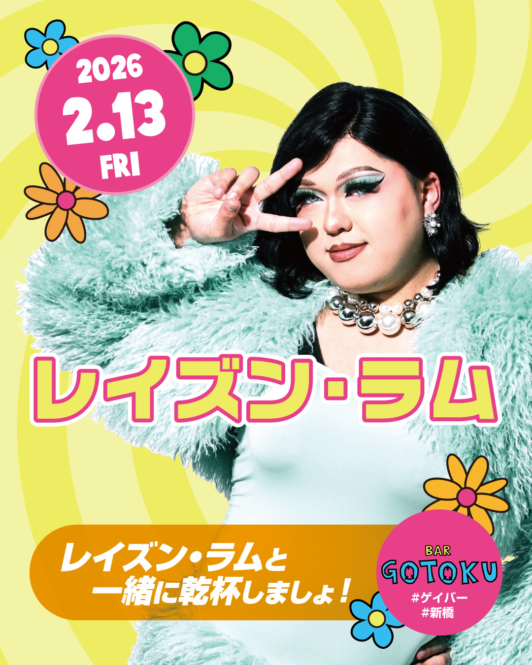 Queen’s Day2026年1月9日はドラァグクイーンのレイズン・ラムさんと一緒に乾杯しましょう!#新橋MIXバー#bar5109 -