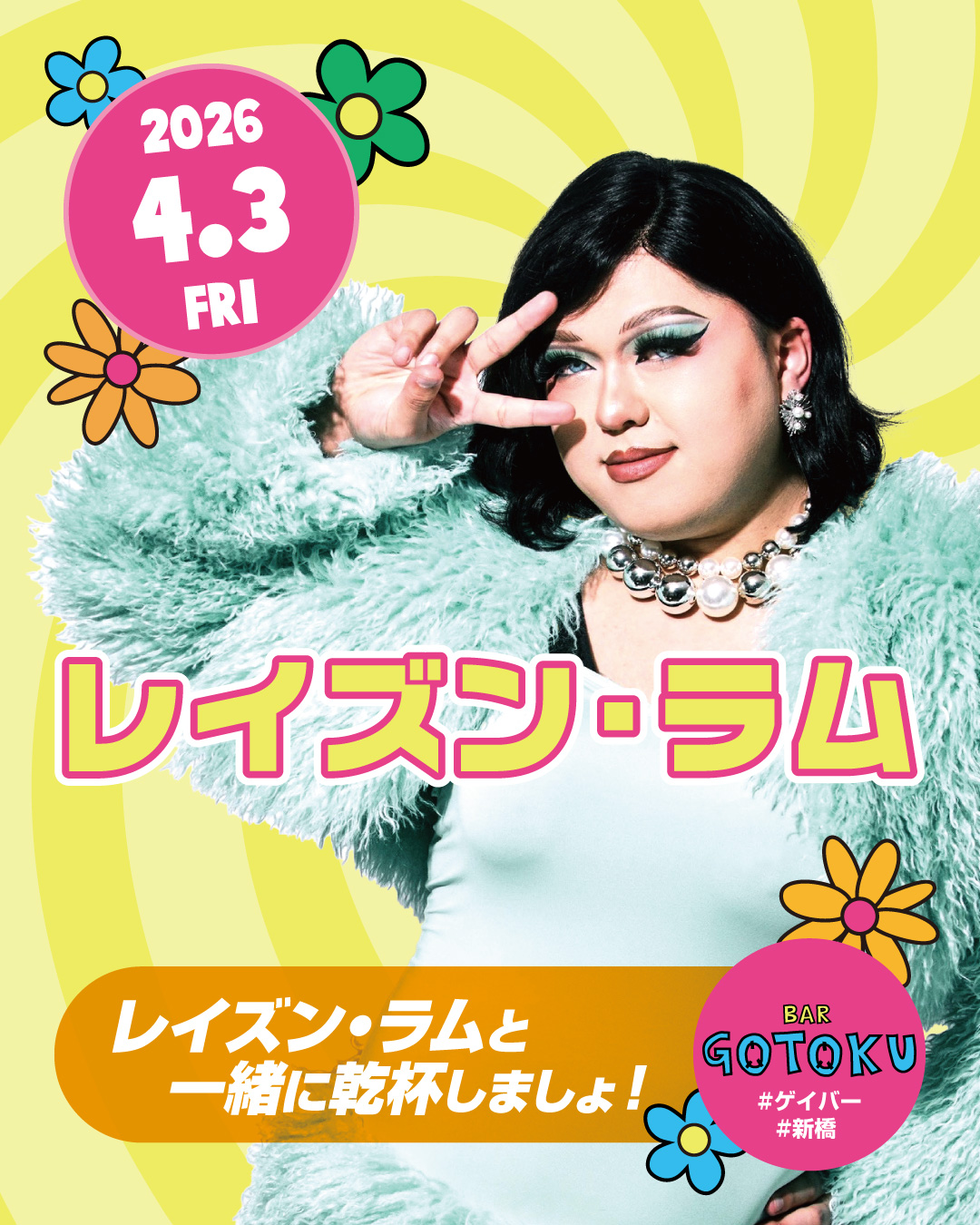Queen’s Day2026年4月3日はドラァグクイーンのレイズン・ラムさんと一緒に乾杯しましょう!#bar5109#新橋MIXバー -